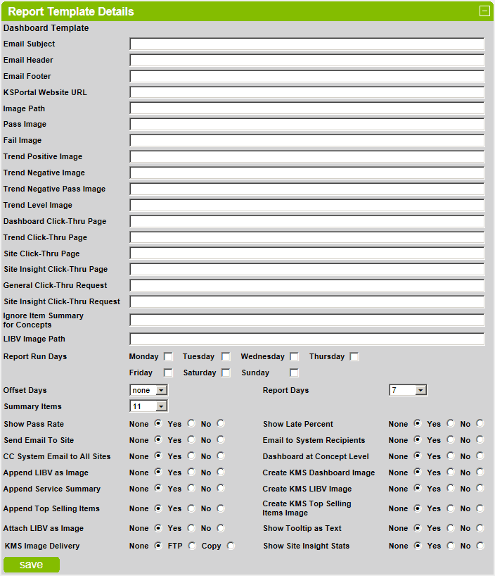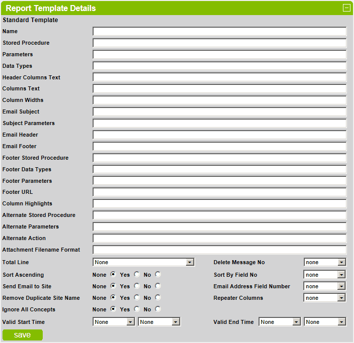 To create a new parent template, check the appropriate report type radio button and click on the new button.
